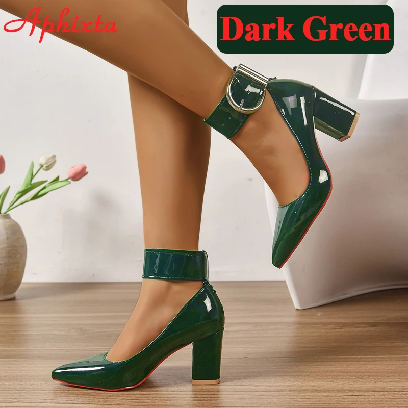Aphixta Dark Green Pumps Women 4cm Wide Strap Belt Buckle Silver Metal Pimps Shoes 7cm Chunky Heels ...