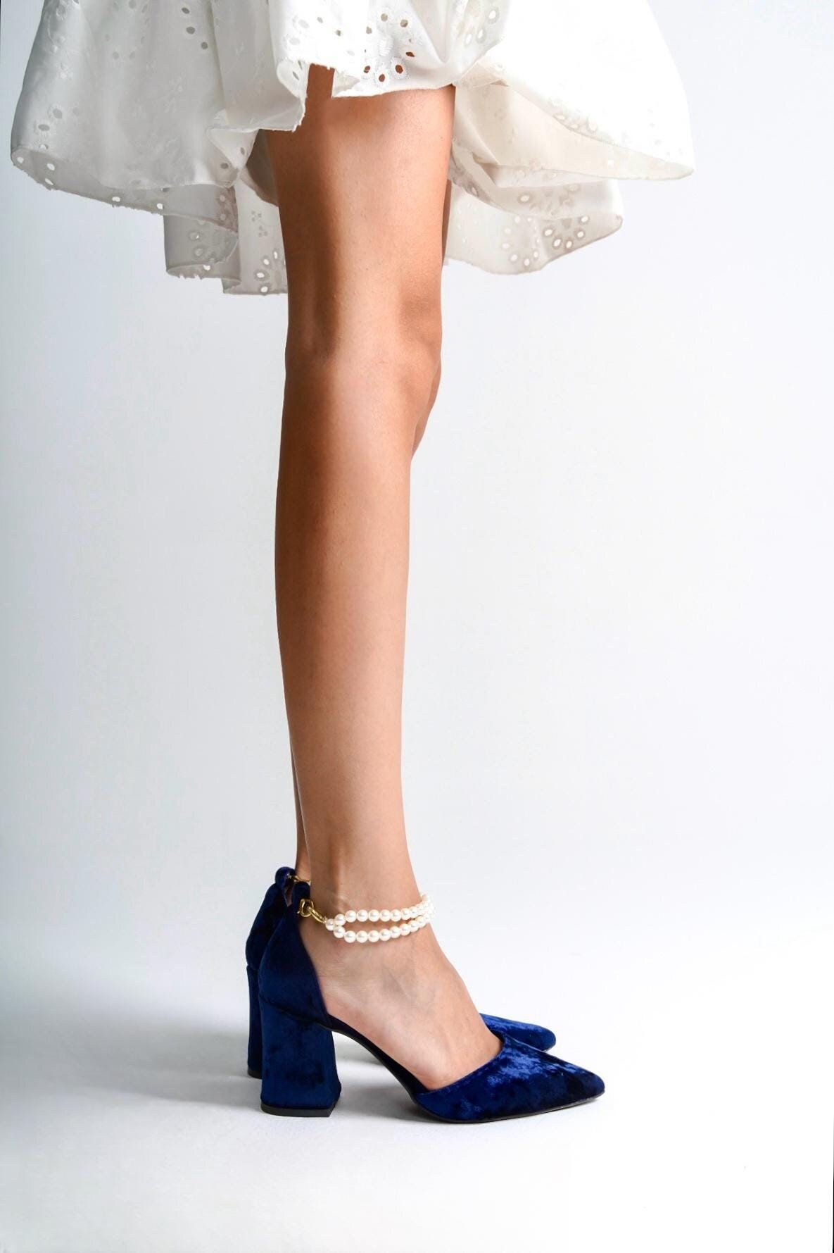Blue Velvet Heels, Blue Velvet Shoes, Blue Block High Heels, Navy Blue Heels, Blue Bridal Shoes, Blu...