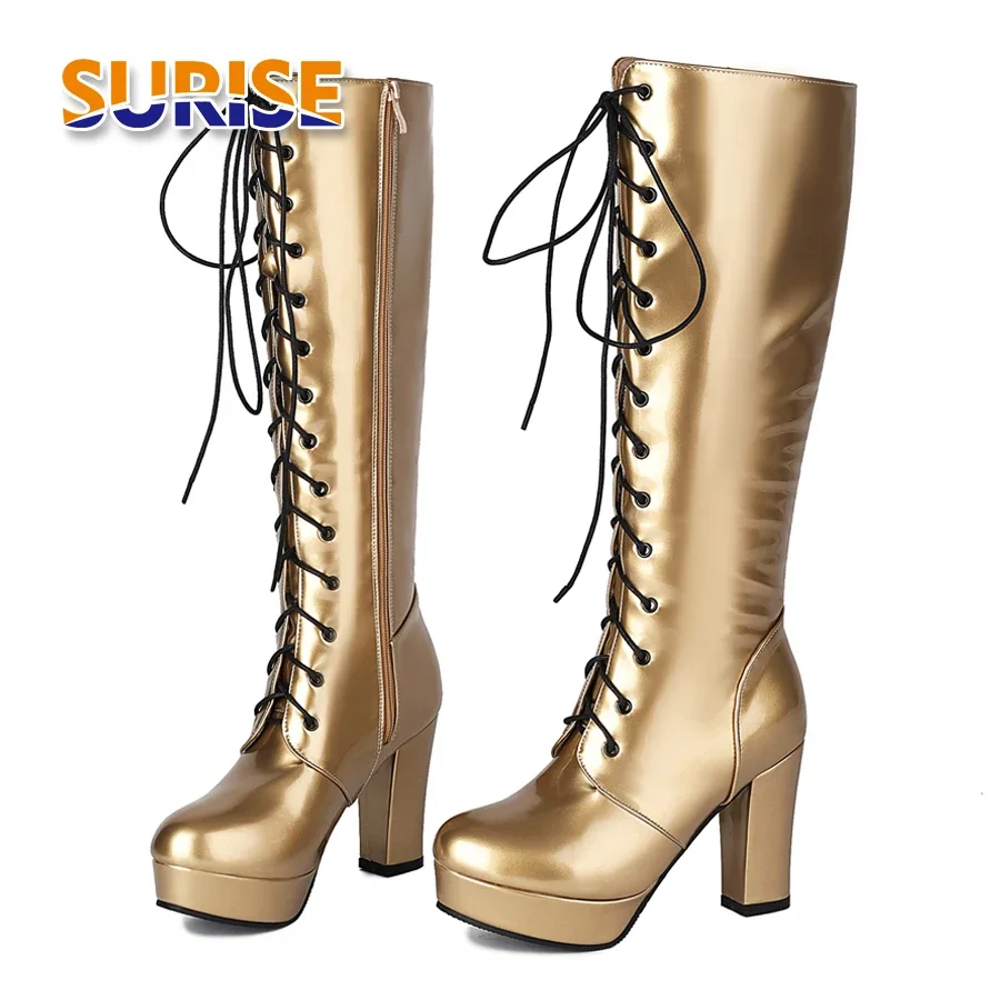 Gold Lace-up Patent Leather Platform Knee High Boots Women Chunky Heel Sexy Red Silver Dress Party L...