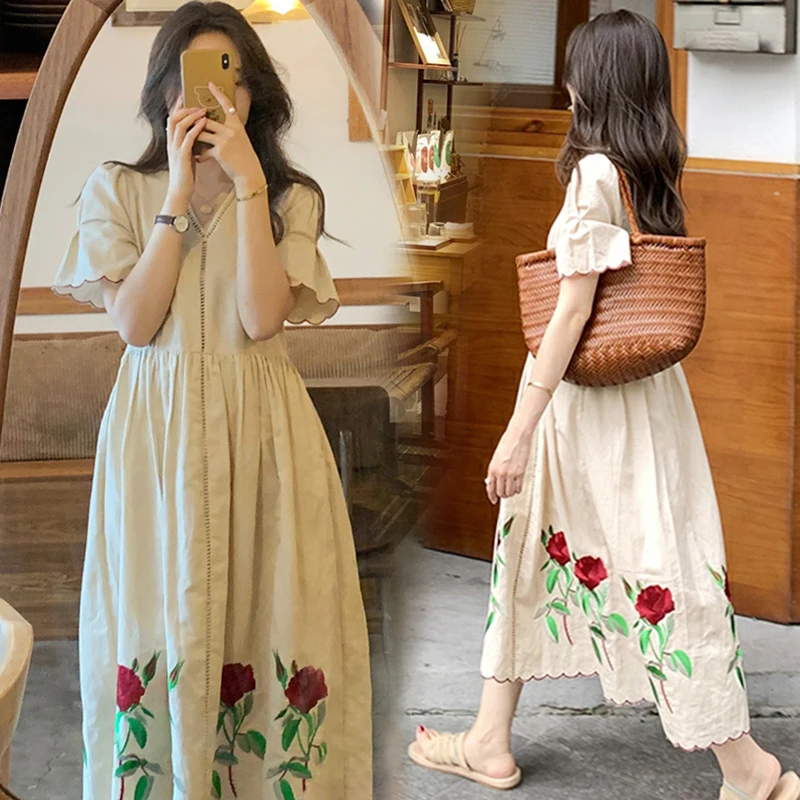 Elegant Rose Long Cotton Linen Dress V-Neck Loose Slimming Summer New Style plus Size A-Line Skirt K...