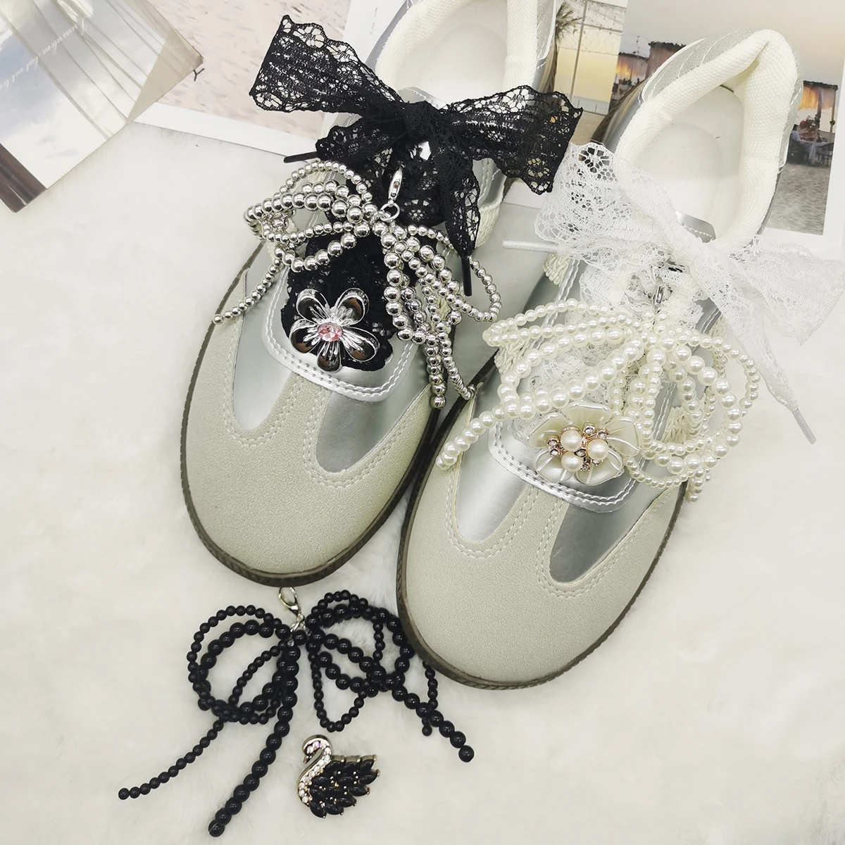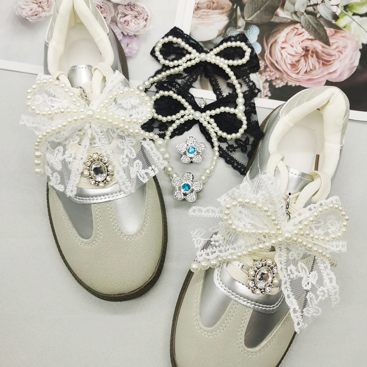 6PCS Lace Shoelaces Decor Baroque Faux Pearl Bow Shoe Pendants Deco...