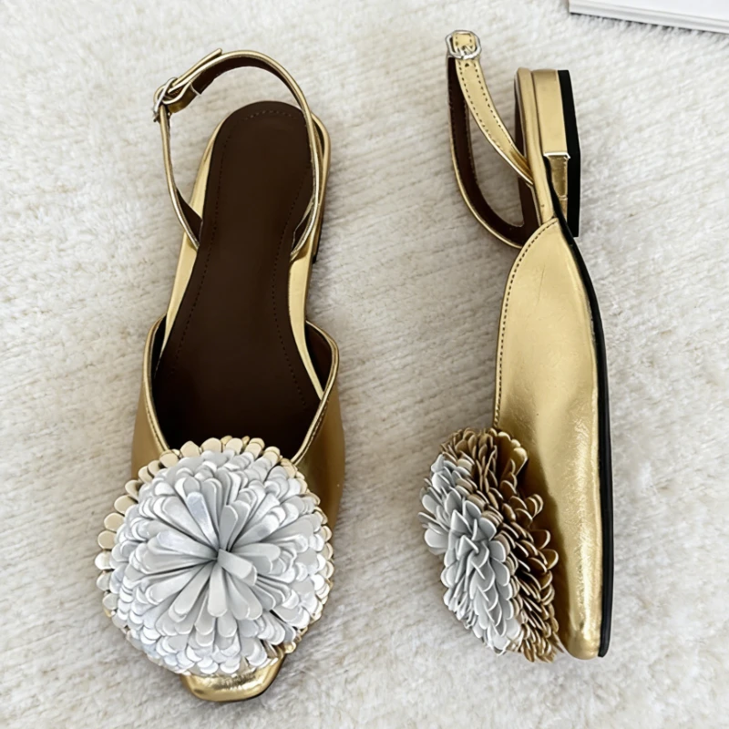 Fashion Silver Flower Decoration Gold Flat Sandals Women 2026 Summer Buckle Strap Low-Heel Pumps Ele...