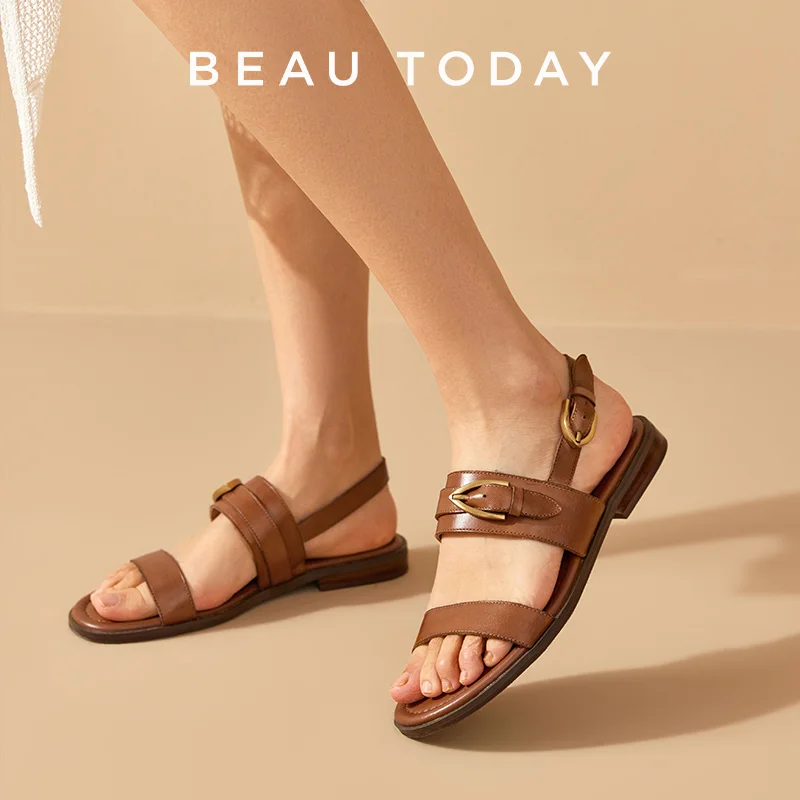 BEAUTODAY Flat Sandals Genuine Leather Metal Buckle Decro Slingback Low Heel Summer Retro Ladies Sho...