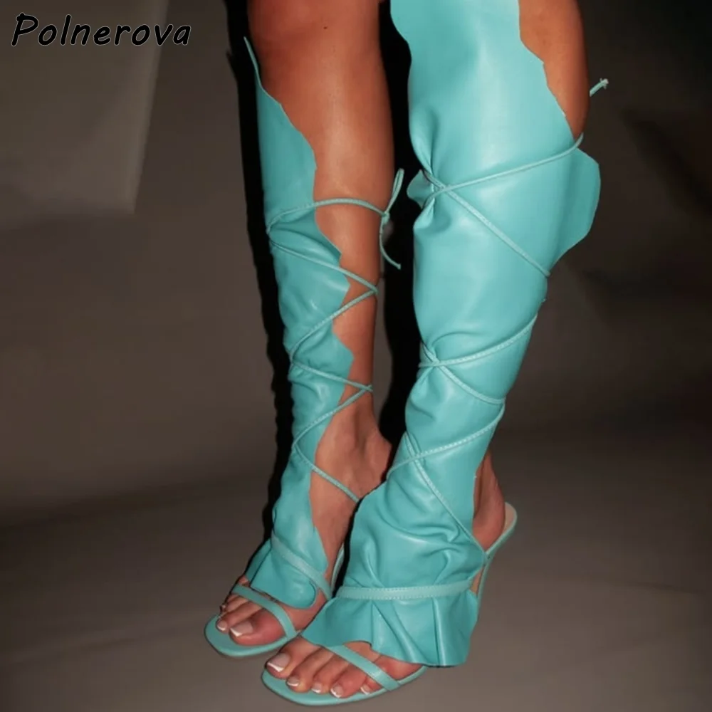 Solid Lace Up Summer Sandals Boots Straight Strap Thin Heels Leather Stiletto Shoes Women's Blue Sex...
