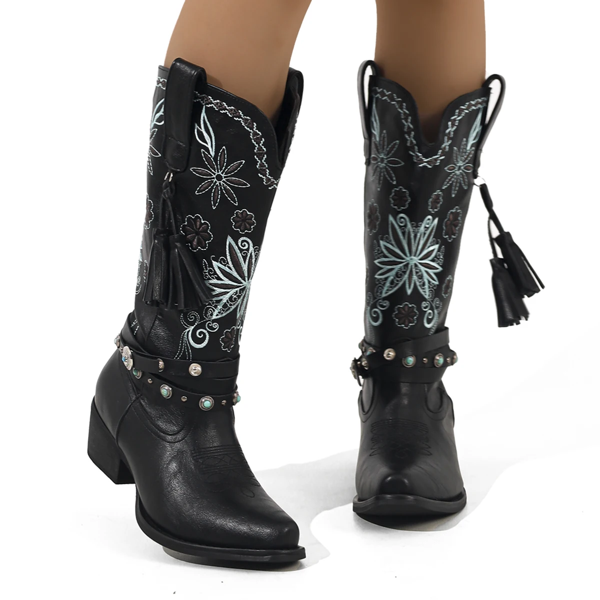 Vintage Square Head Thick Heel Cowboy Boot for Women Embroidered We...