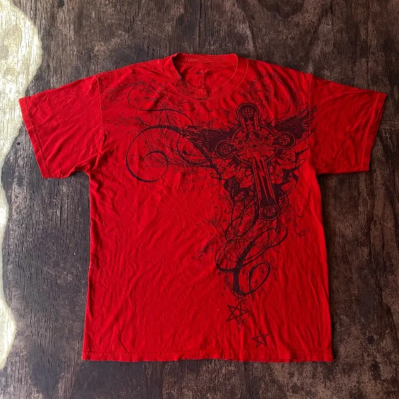Y2K Fashion Harajuku Style Red Printed T-shirt Men Street Casual Joker Hip Hop Popular Gothic Loose ...