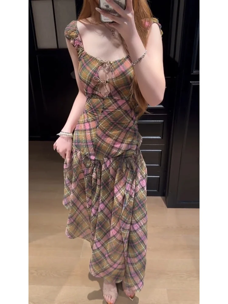 SYXATN N13 Vintage Plaid Hollow out Dress Asymmetrical Beach Vacation Women's Dress Spring Summer Sl...