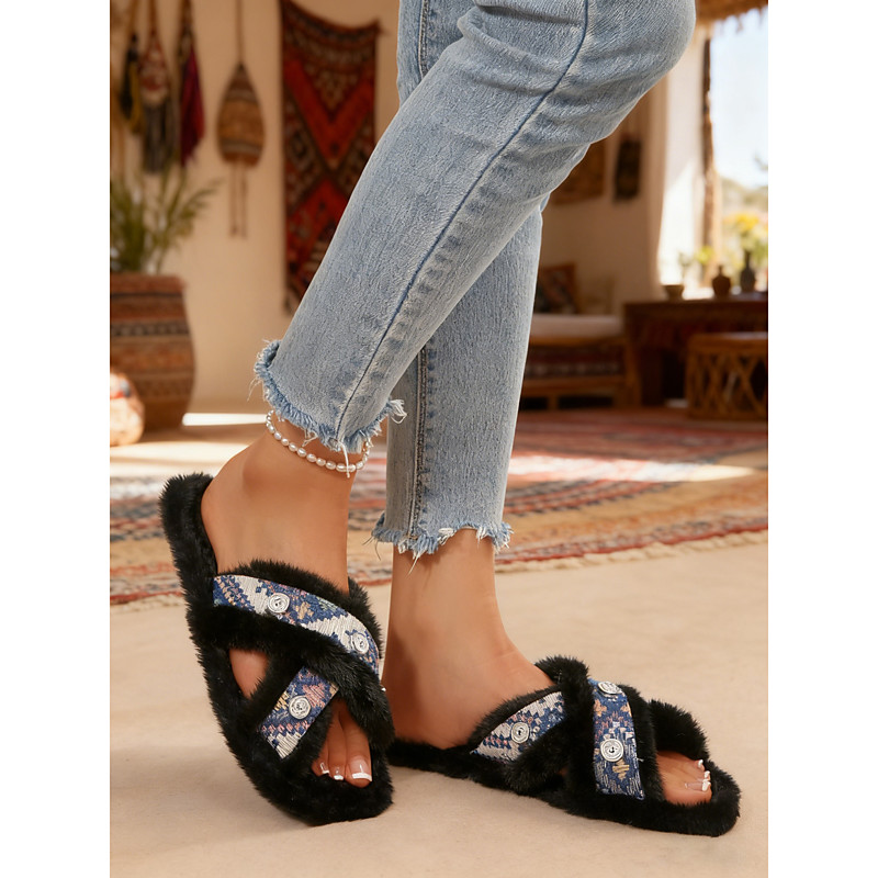 Women's Pink Fluffy Faux Fur Cross Band Slides – Plush Open T...