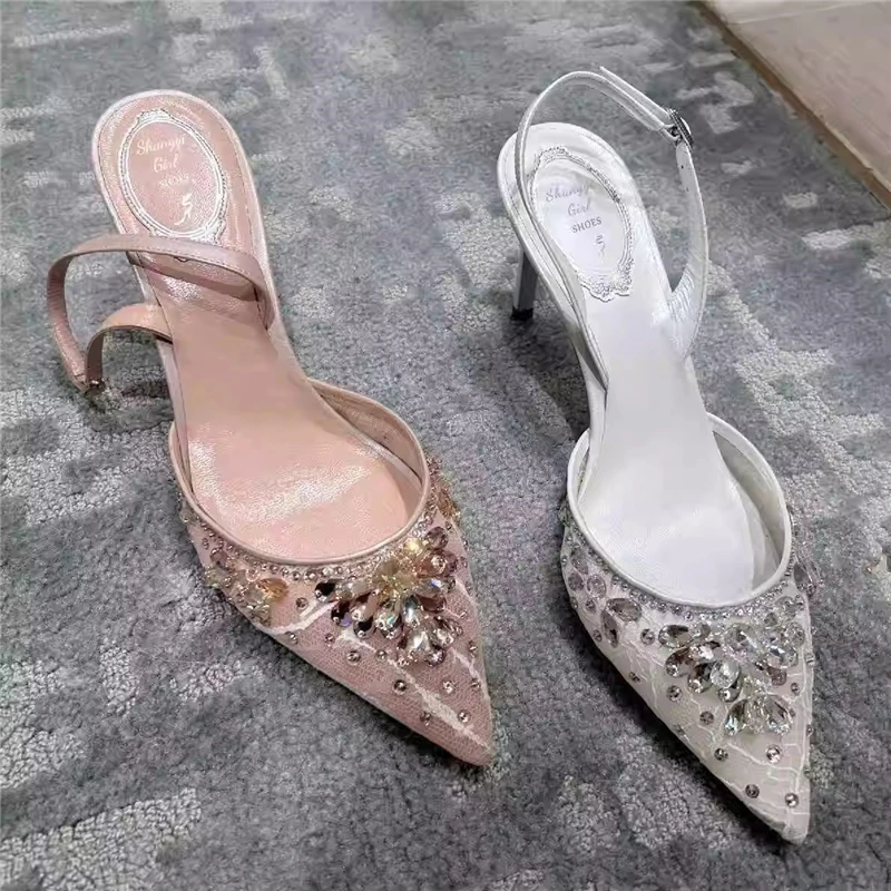 New High Heels Shoes Woman Pointed Peep Toe Rhinestone Party Wedding Shoes Mesh Lace Women Pumps Hee...