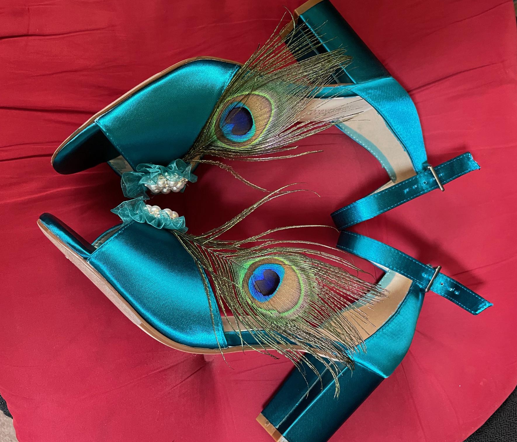 Teal Satin Wedding Shoes: Peacock Feather Block Heels M and W Width