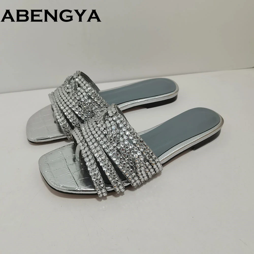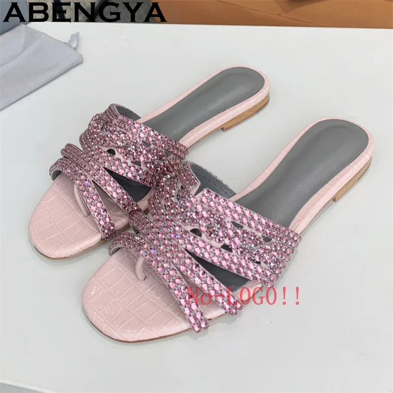 Gliter Crystal Shoes Flat Slippers Woman Shoes Summer Open Toe Slides Leather Modern Slippers Rhines...