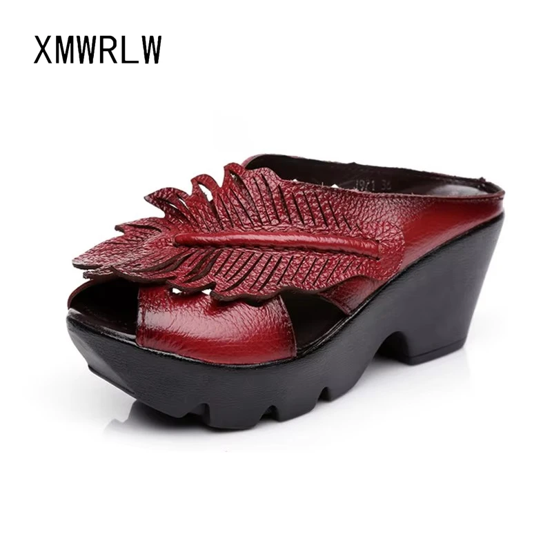XMWRLW Genuine Leather Slippers For Women Summer Retro Handmade Ladies Shoes Slippers Platform Slipp...