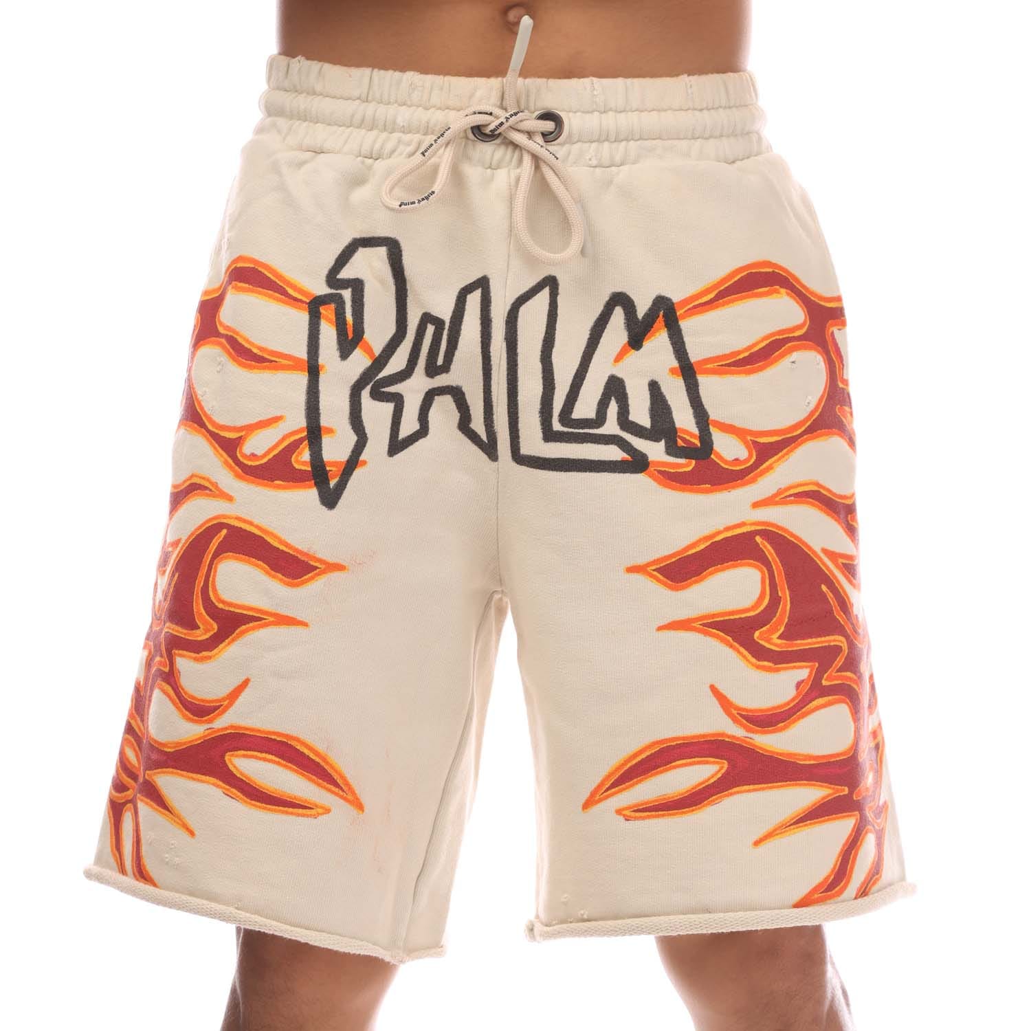 Palm Angels Mens Garment Dye Graffiti Flames Sweat Shorts in Off Wh...