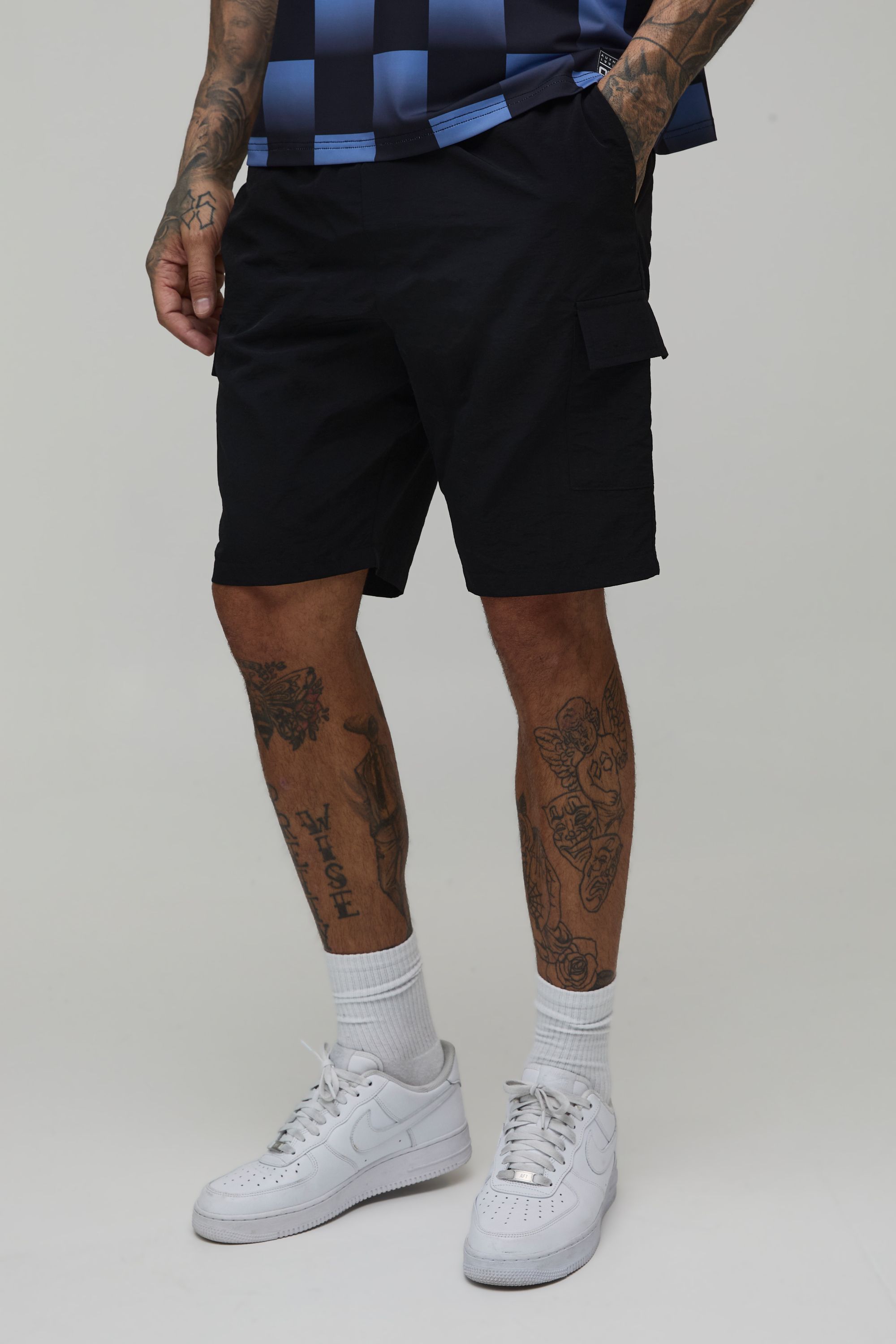 Boohooman Mens Tall Slim Fit Elasticated Nylon Cargo Shorts - Black...