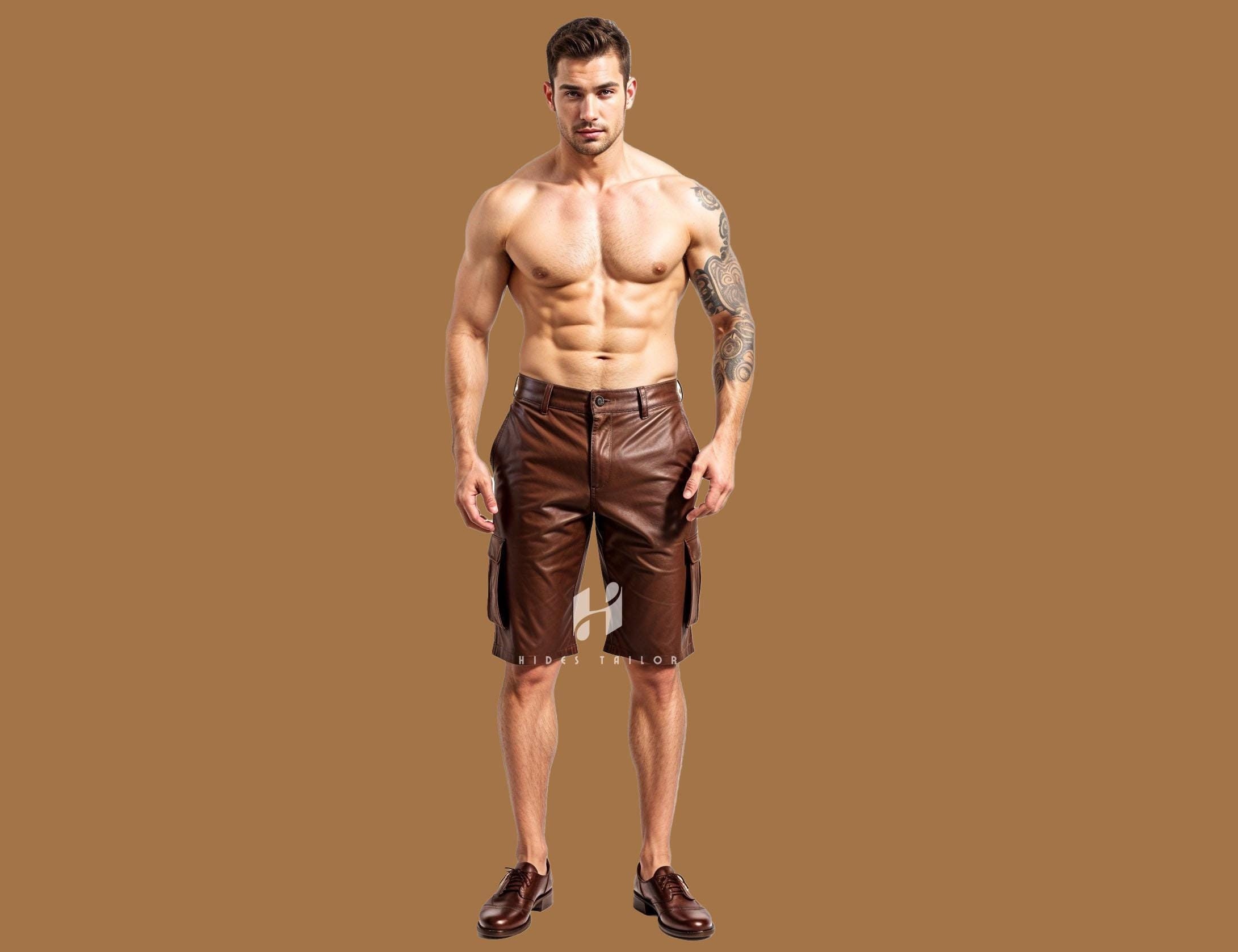 100% Genuine Leather Brown Cargo Shorts for Men- Leather Shorts For...