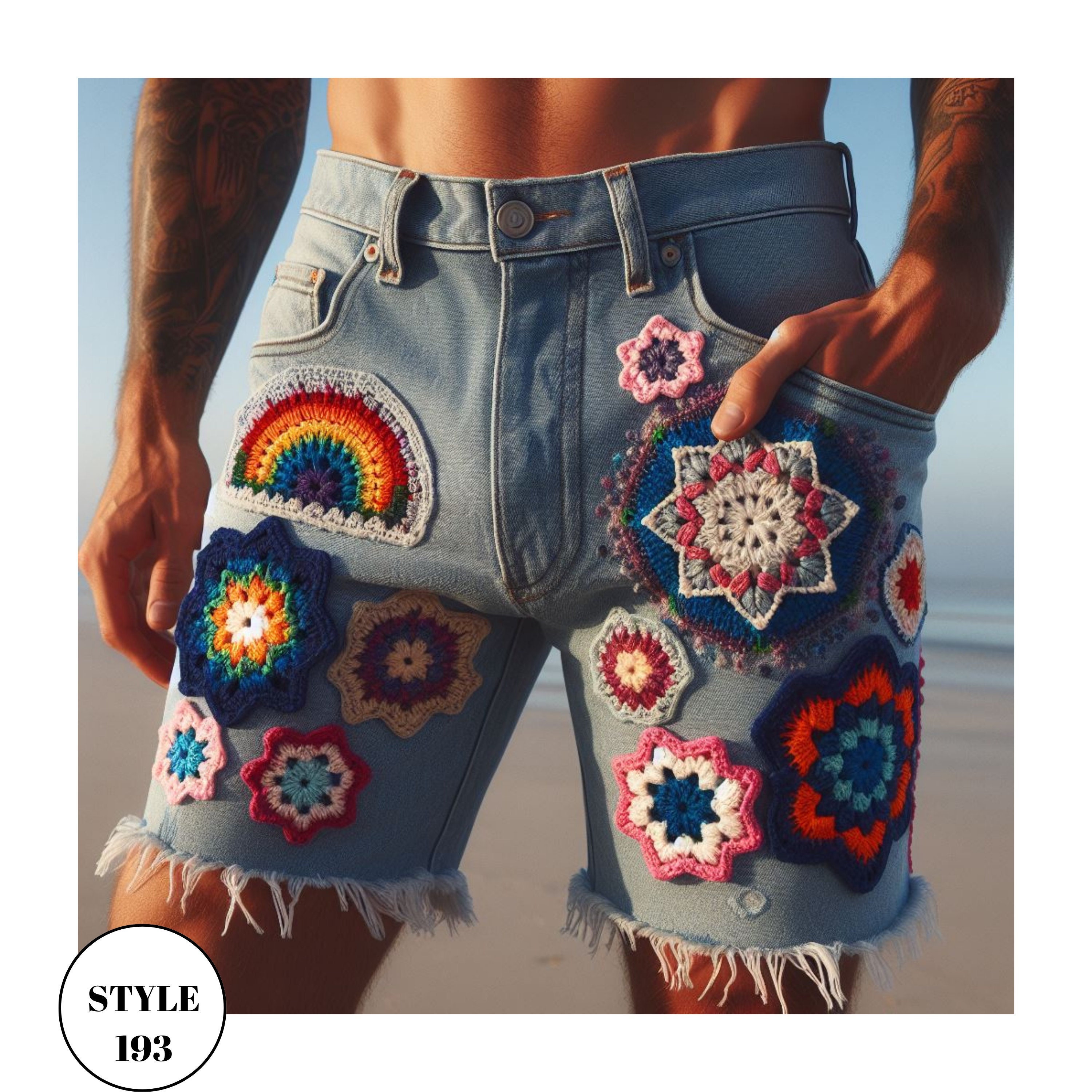 Crochet Denim Shorts Mens, Men's Denim Jean Shorts, Granny Square R...