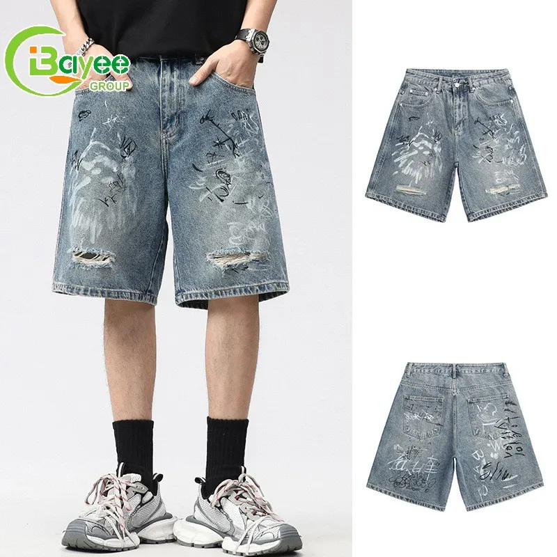 Men Summer Stretchy Denim Shorts Jeans For Men Streetwear Letter Ripped Knee length Baggy Comfort Ca...