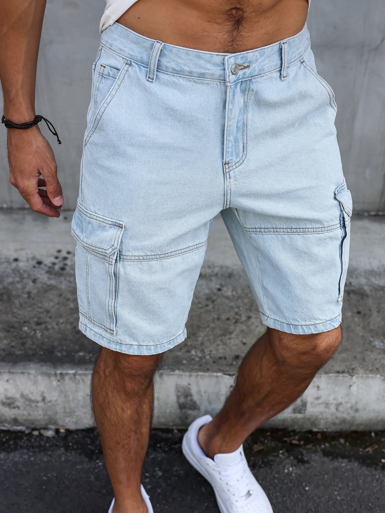 Men's summer light blue regular denim shorts. In a utility style. With a multi-pocket design. Casual...