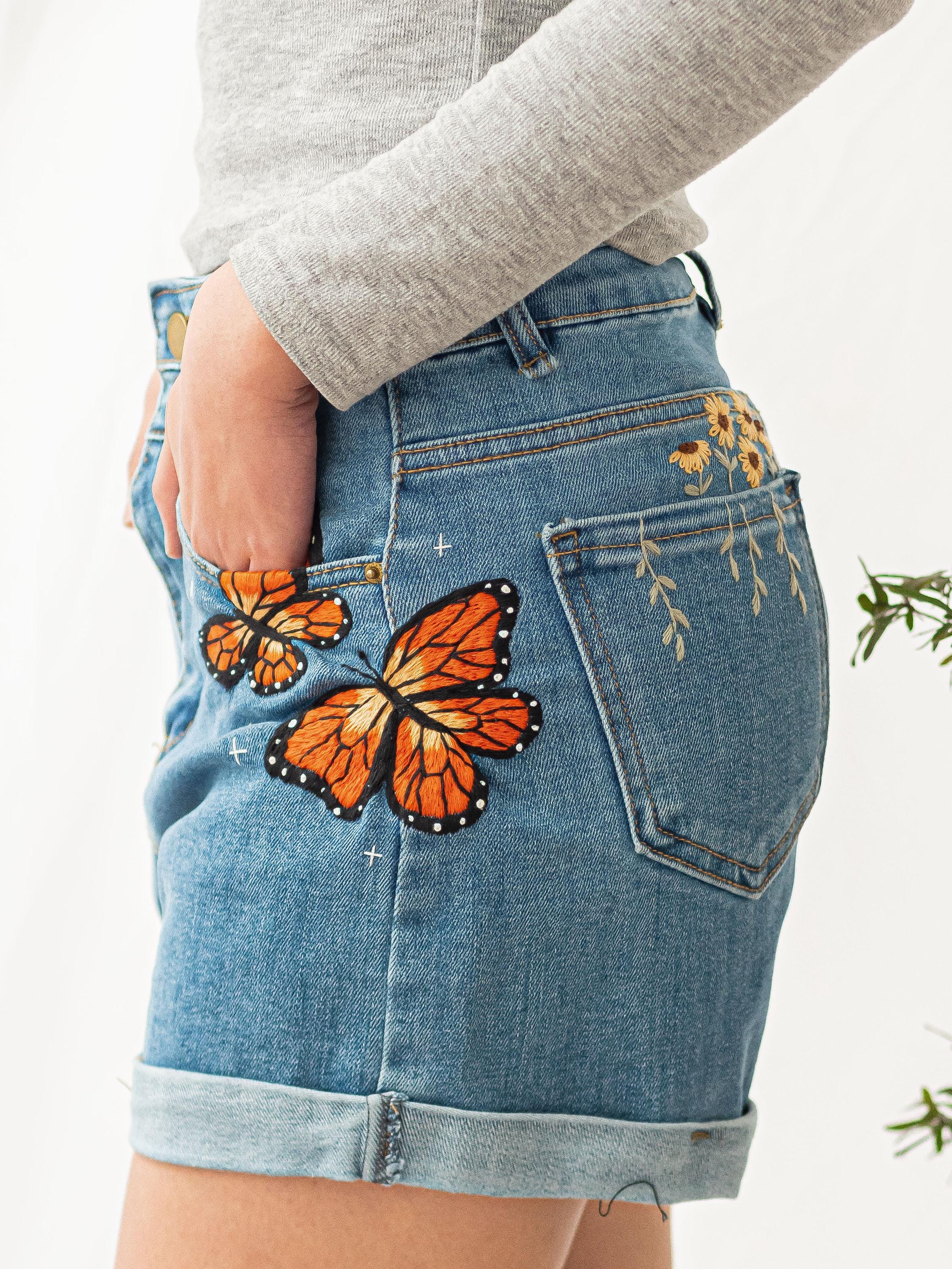 Butterfly Embroidered Denim Shorts, Floral Jean Shorts Women, Daisy...