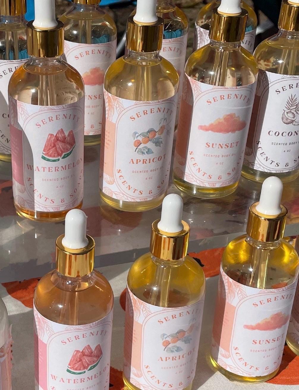 handcrafted body oil, scented, coconut oil, almond oil, jojoba oil,...