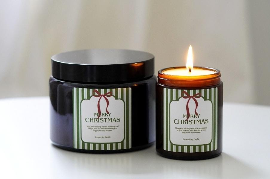 CHRISTMAS CANDLES IN TWO SIZES: 180ML and 500ML. Featuring FESTIVE Label, that can be personalised w...