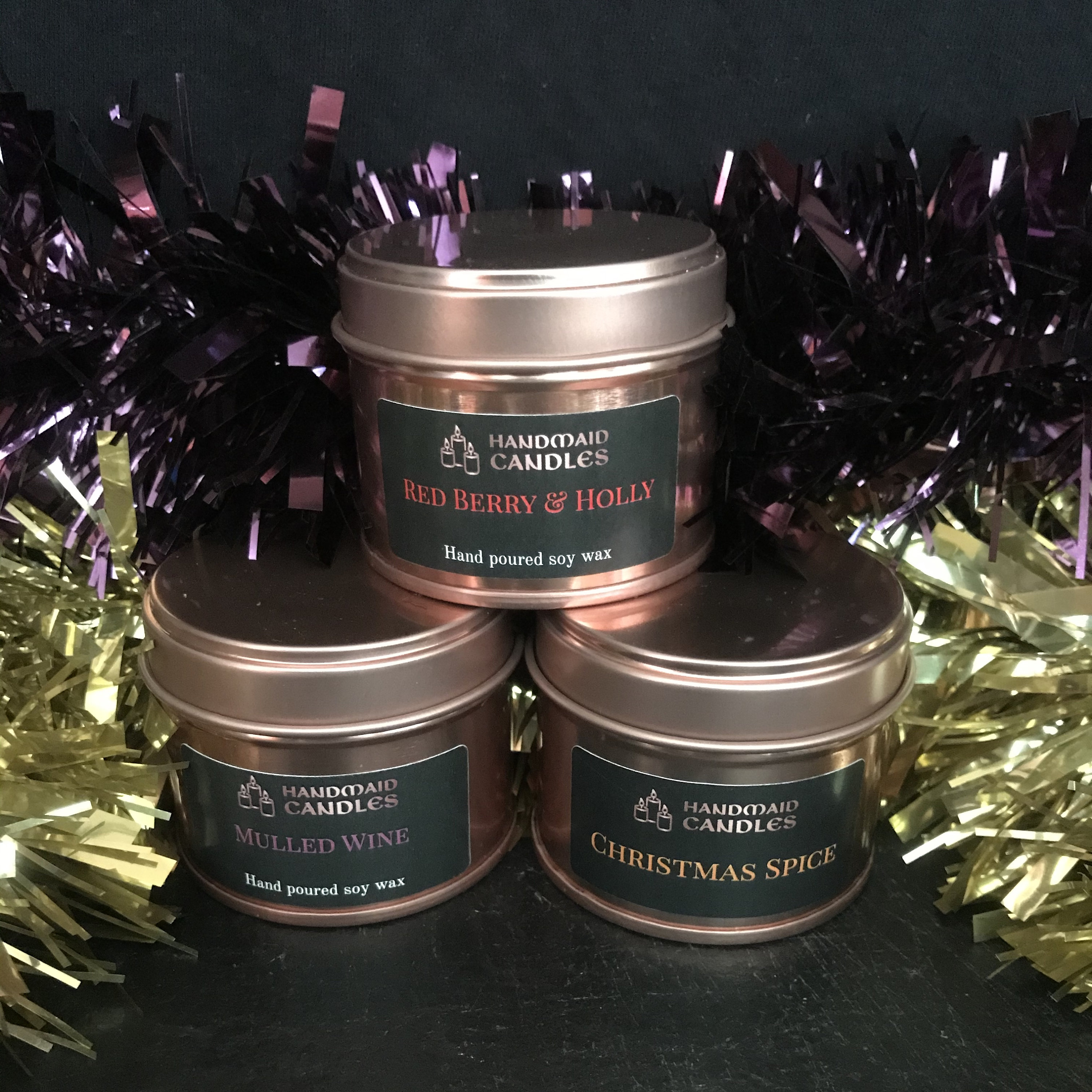 HandMaid Candles A festive gift box of 3 - 100ml tin Christmas themed scented candles. A perfect gif...