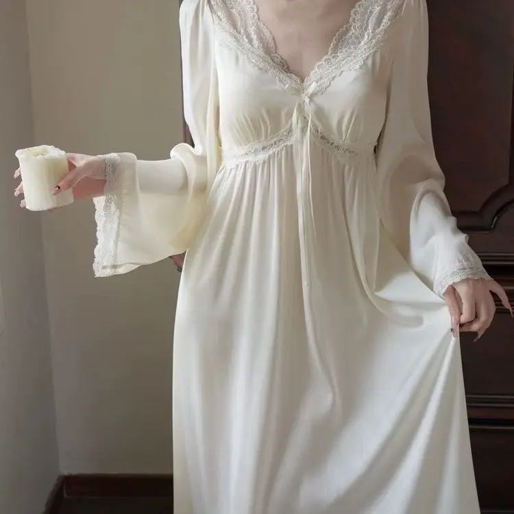 Lace Vintage Nightgown French Retro Court Style Ultra-thin Nightdress Dressing Gown V Neck Super Fai...