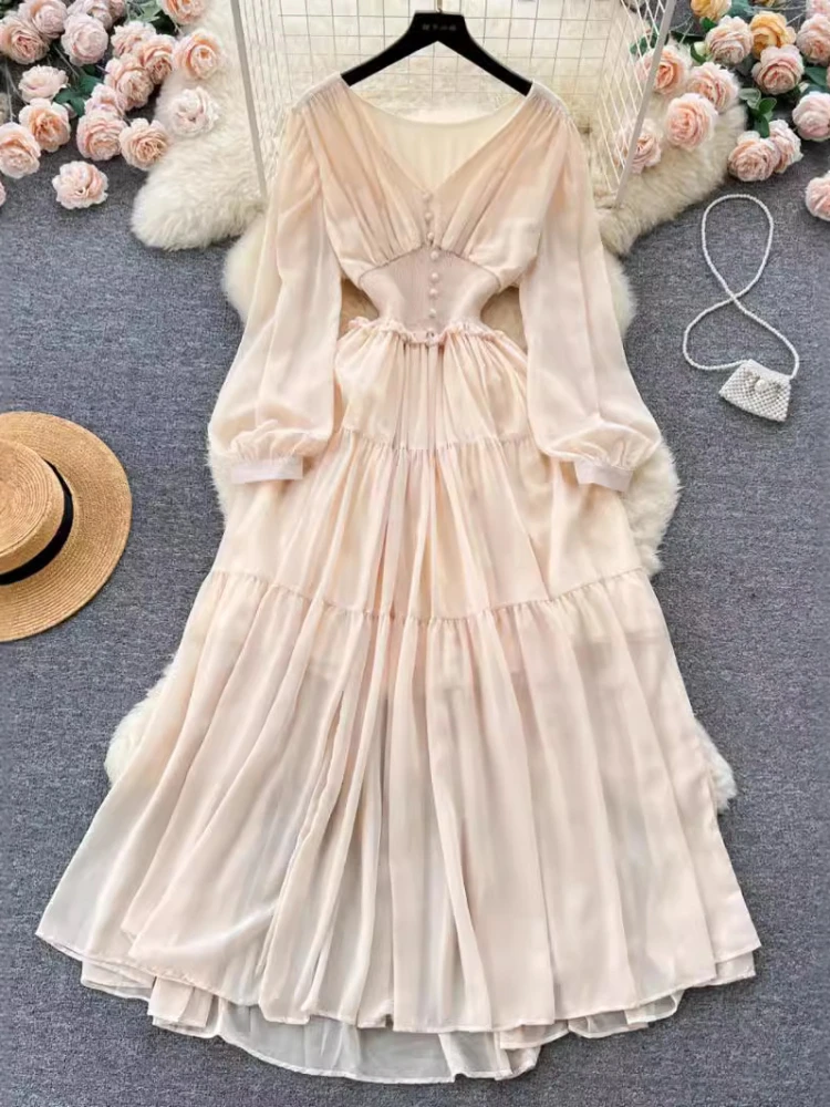 Vintage Chiffon Long Dress Women Elegant V-neck Long Sleeved Casual Dresses French Pleated Slim A-li...