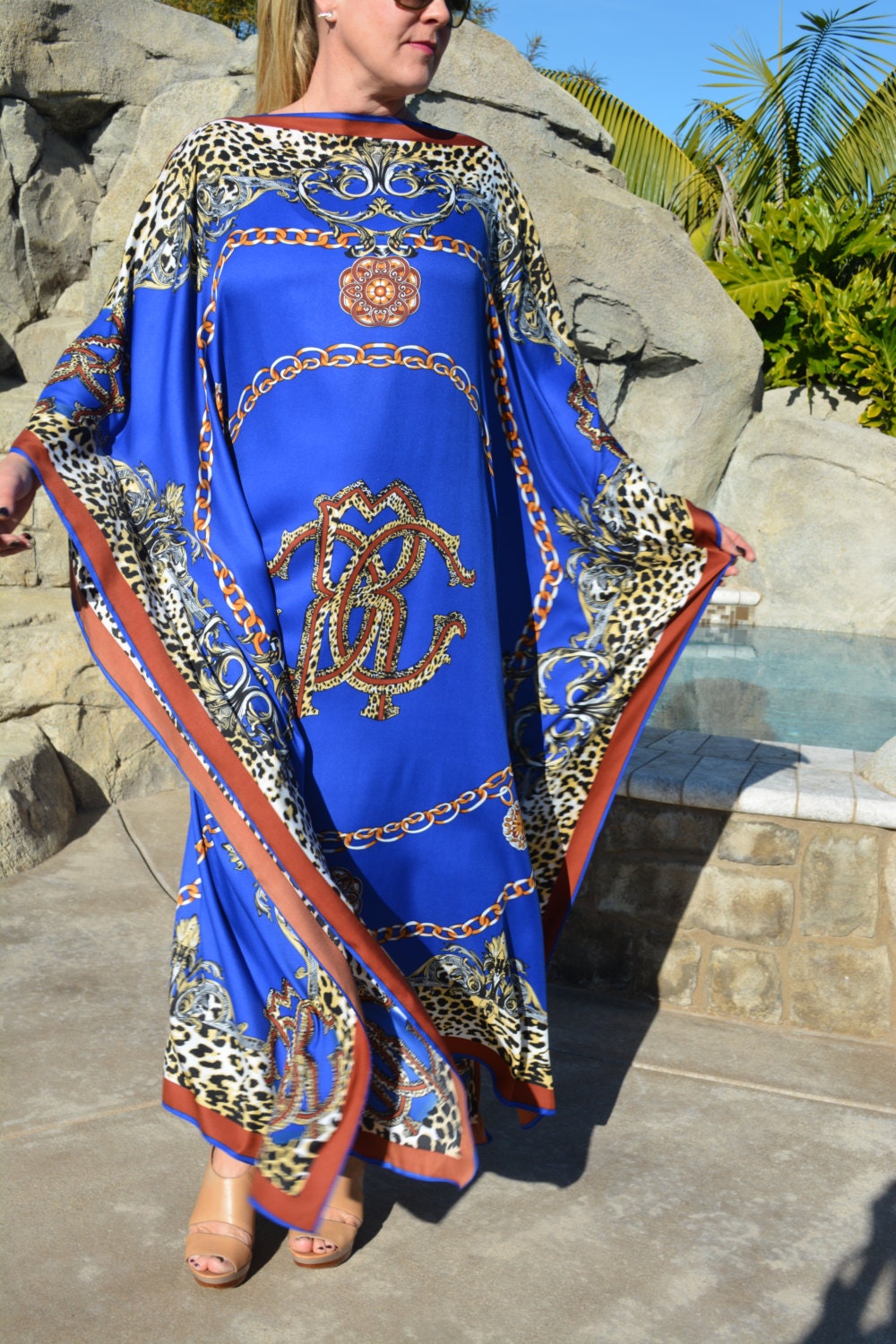 Vivid blue designer print (Roberto Cavalli) silk caftan. Soft, smooth non-sheer silk, flows beautifu...