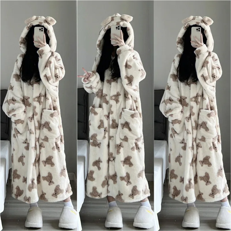 Women Autumn Winter Warm Flannel Nightgown Thickened Long-sleeved Pajamas Coral Velvet Button Hooded...