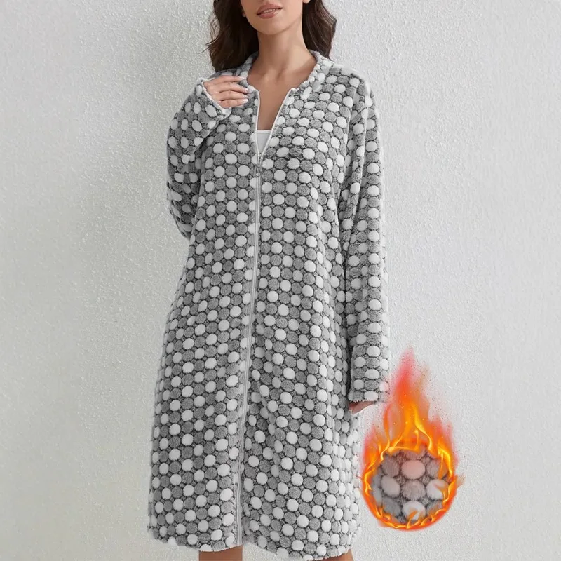 Women's Casual Long Sleeved Flannel Nightgown Thickened Thermal Zipper Pajamas for Autumn Winter Rob...