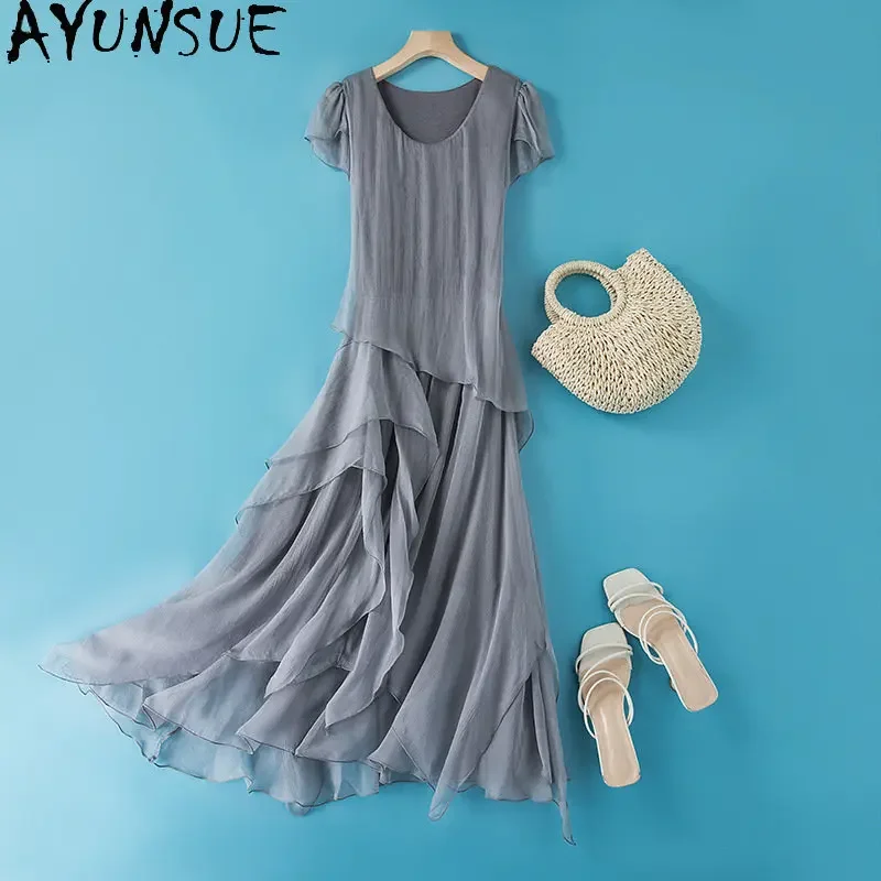 Beach 100% Mulberry Real Silk Dress Women Clothing O-neck Elegant Midi Desses Woman Summer Fairy Dre...