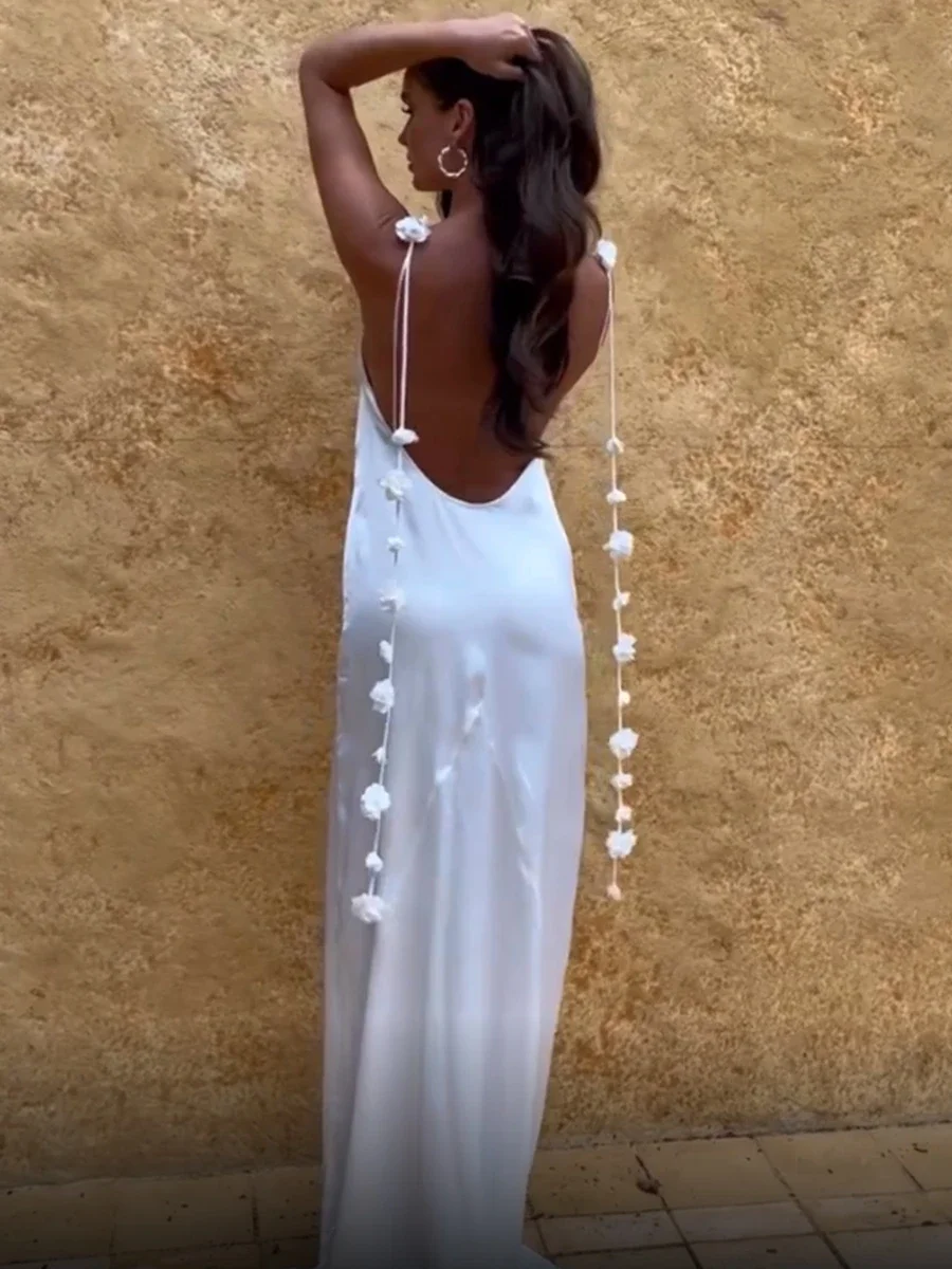 Combhasaki Women's Vintage Solid Color Flower Tassel Backless Sleeveless Summer Party Club Satin Max...