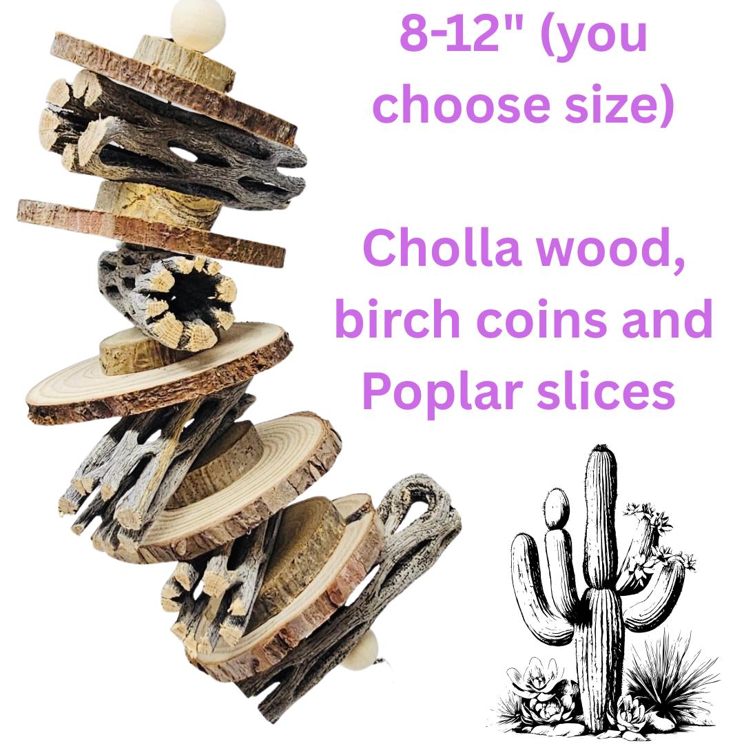 "Hanging chew toy made out 3 different woods! Great way to keep them entertained :) Poplar Wood...