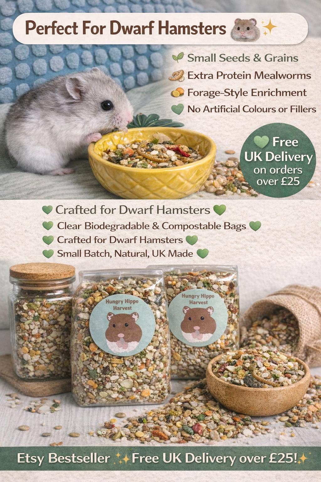 At Hungry Hippo Harvest, we make dwarf hamster food designed for lower fat and sugar requirements, u...
