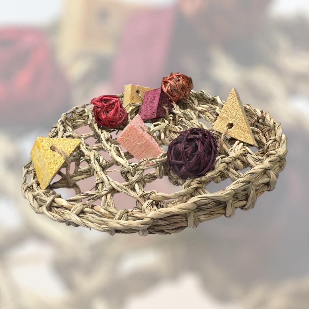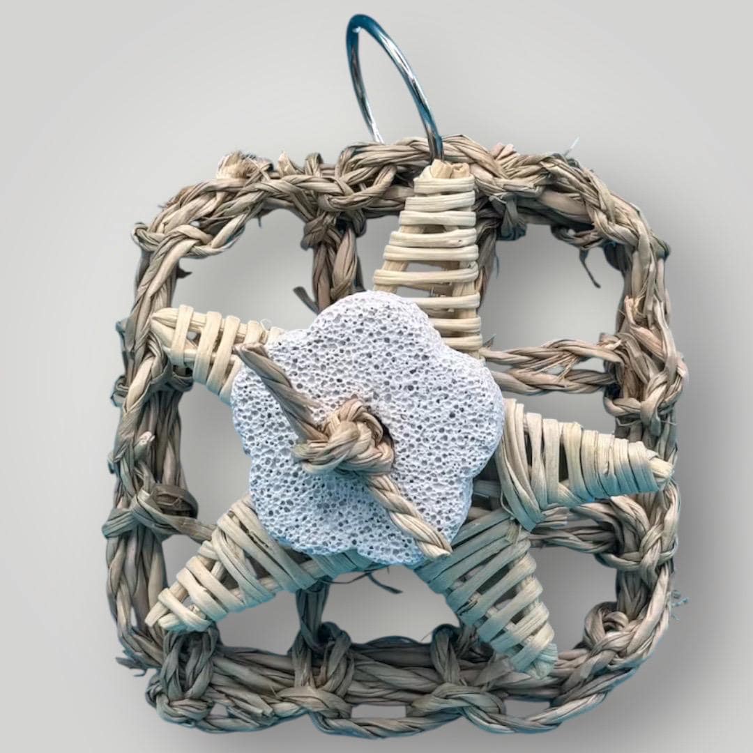 Hanging chew toy made out of Pine wood, seagrass and optional add on to add bamboo traps One toy per...