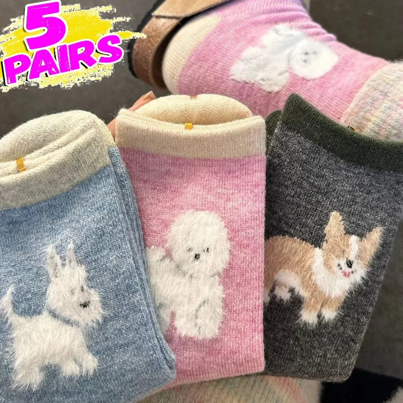 • 1/5Pairs Cute Plush Dog Pattern Socks for Women Autumn Warm Cotton ...
