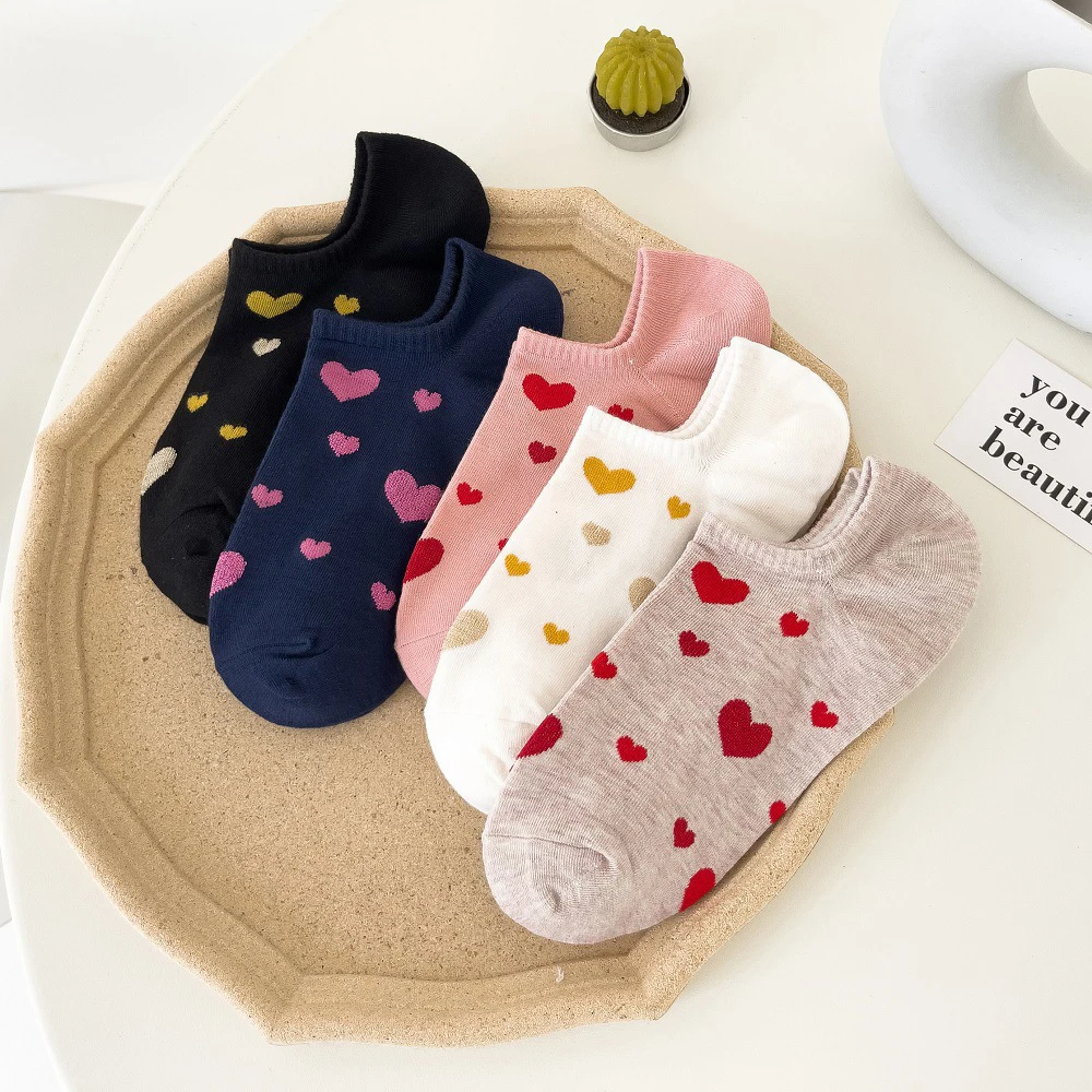 5 Pairs of Mixed-Color Heart Socks for Women, Spring and Summer Short Socks, No-Show Socks, Cartoon ...