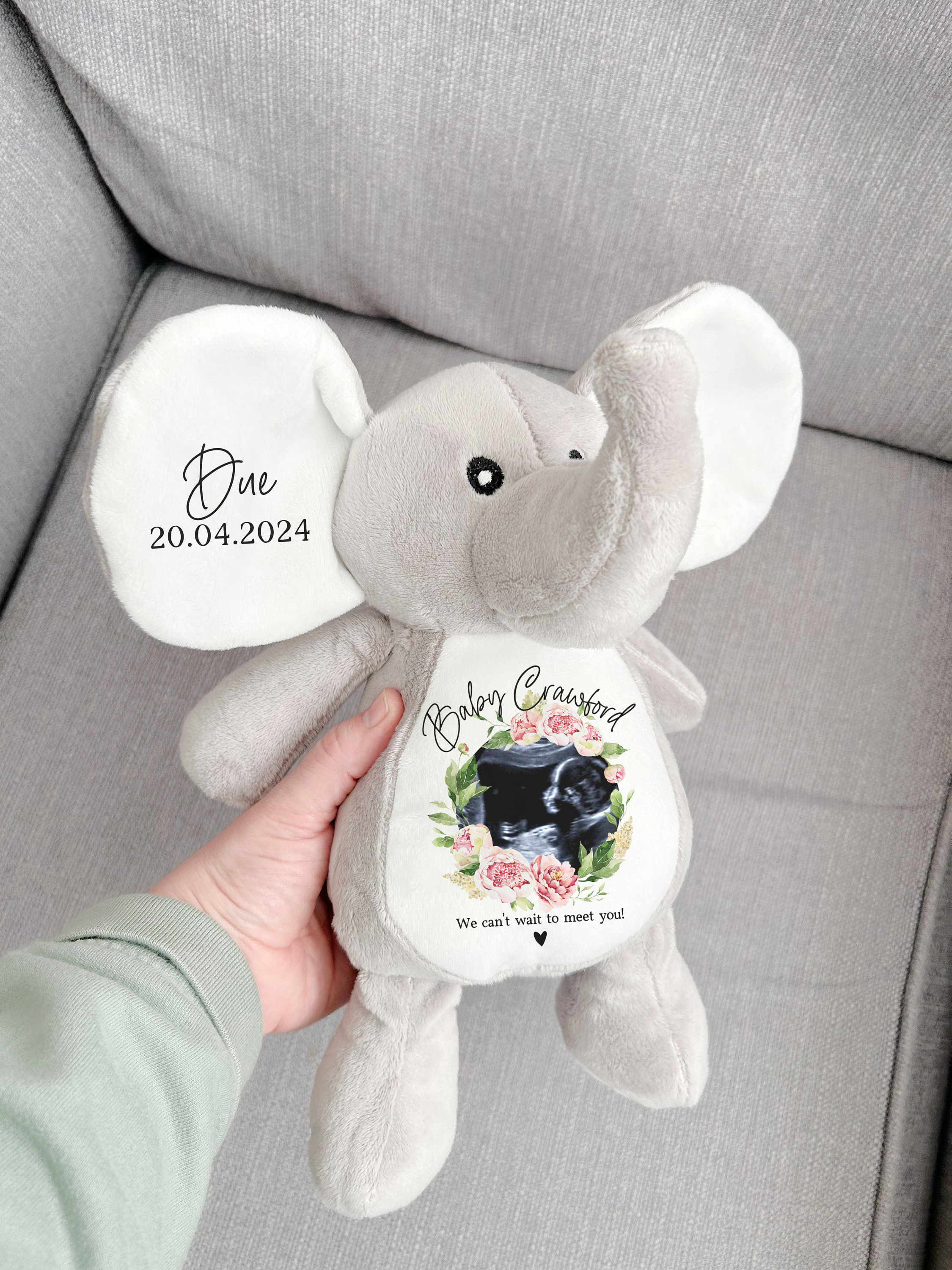 A beautiful elephant teddy keepsake, personalised with your scan picture for a truly unique and thou...