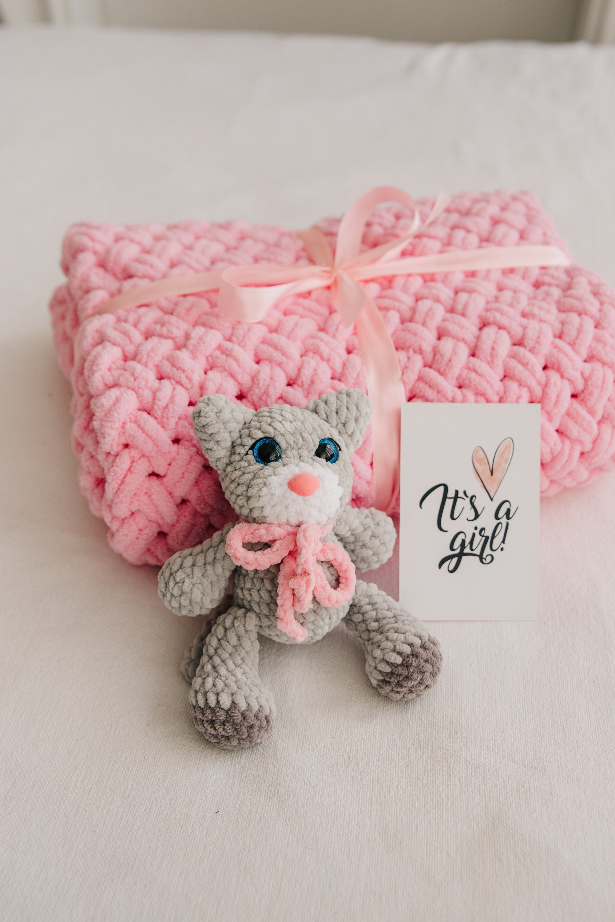 It's a girl Pink crochet baby blanket Crochet toy cat New baby girl...