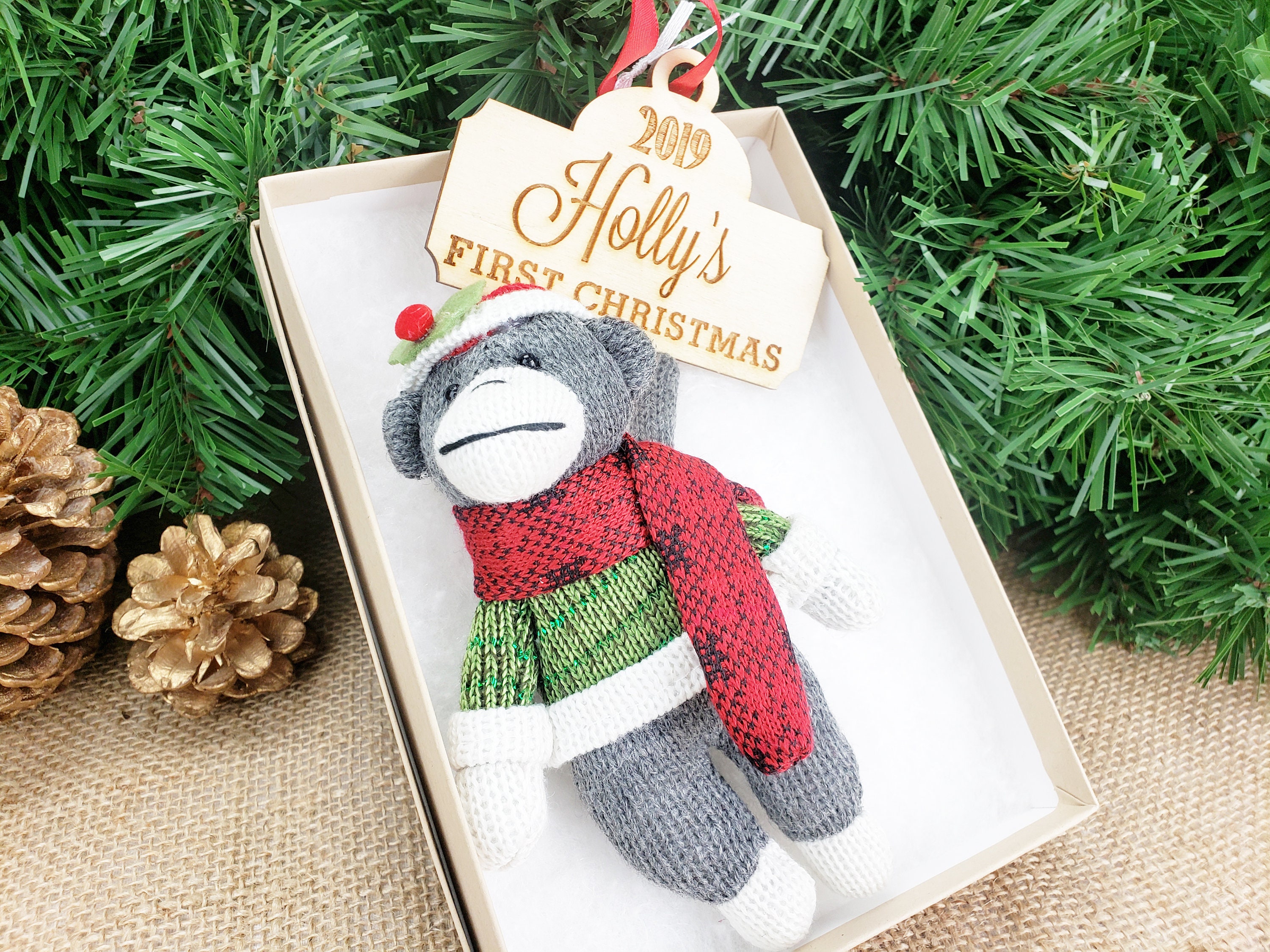 Monkey Personalized Christmas Ornament / Sock Monkey Ornament / Bab...