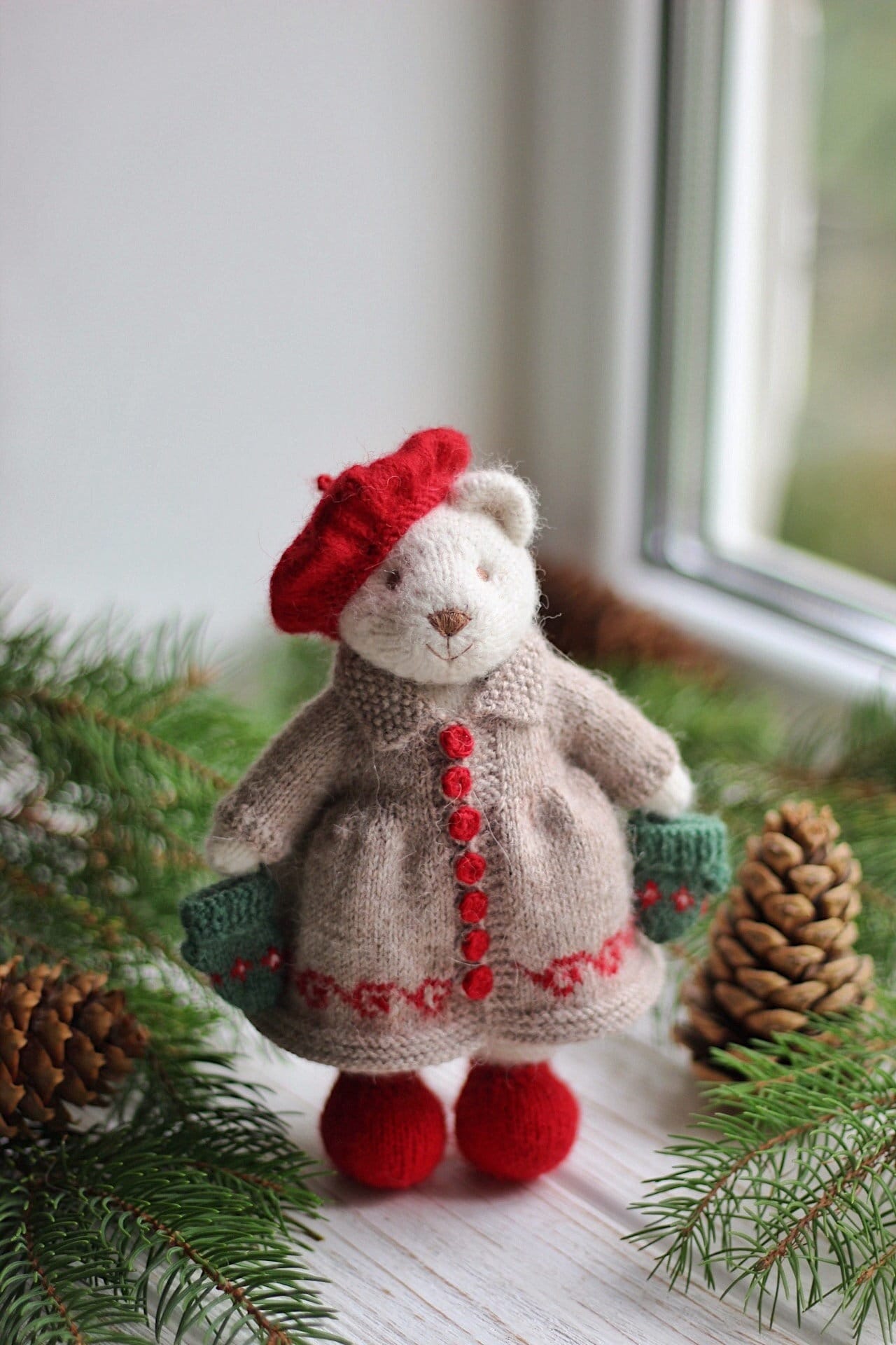 Knitted Christmas polar bear girl in coat and red hat - Knitted stu...