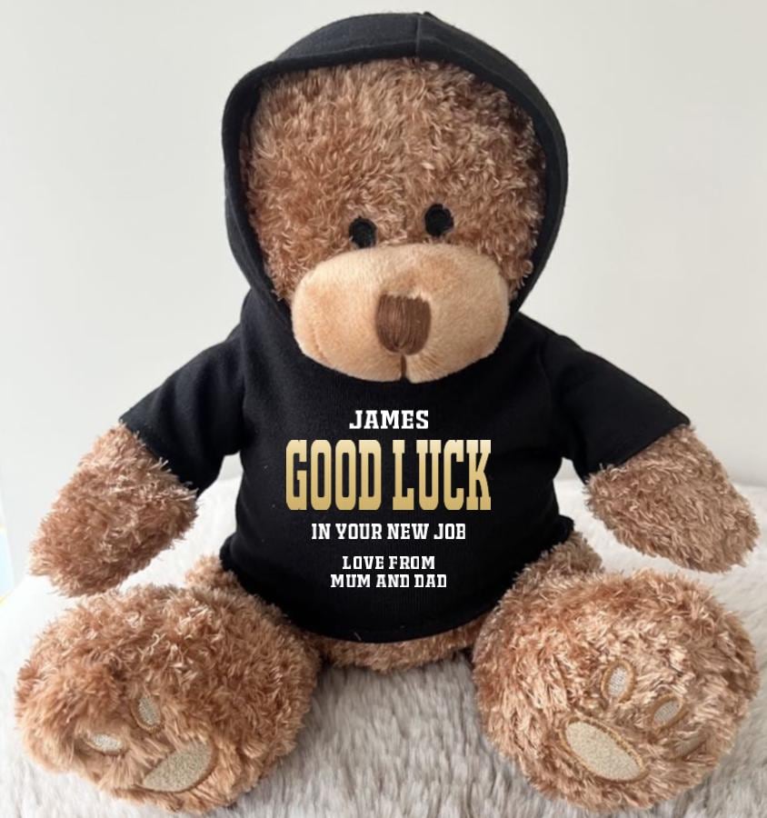 Personalised Good Luck New Job hoodie bear. Such an adorable keepsake. GOOD LUCK is in a stunning go...
