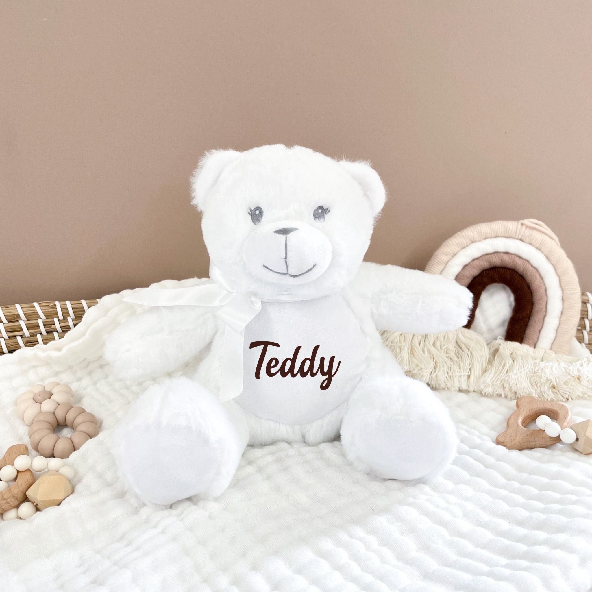 Personalised Name White Teddy with White ribbon bow, New Baby Gift
