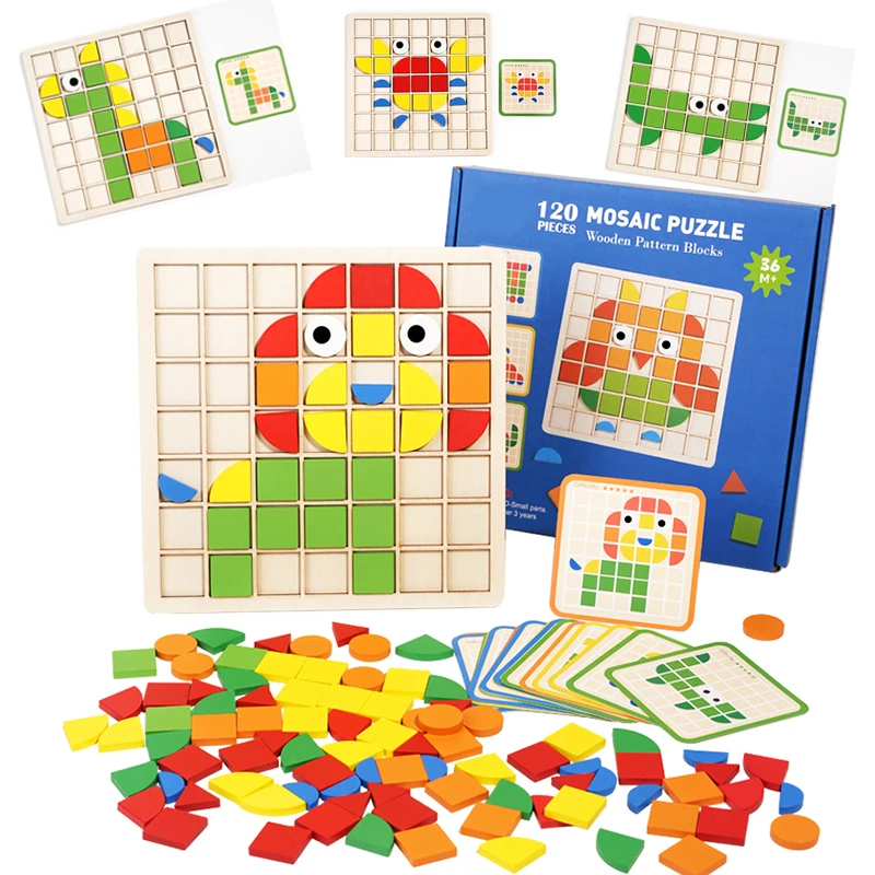 120Pcs Wooden Mosaic Puzzle Toy Montessori Kids Wooden 3D Geometric Shape Jigsaw Puzzle Board Set Ba...