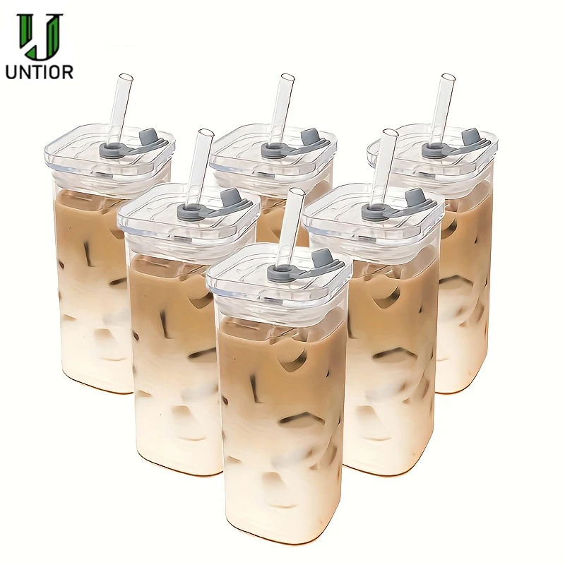 UNTIOR 4pcs Set of Square Glass Cups with Lids and Straw - Portable Drinking Glasses & Coffee Mu...