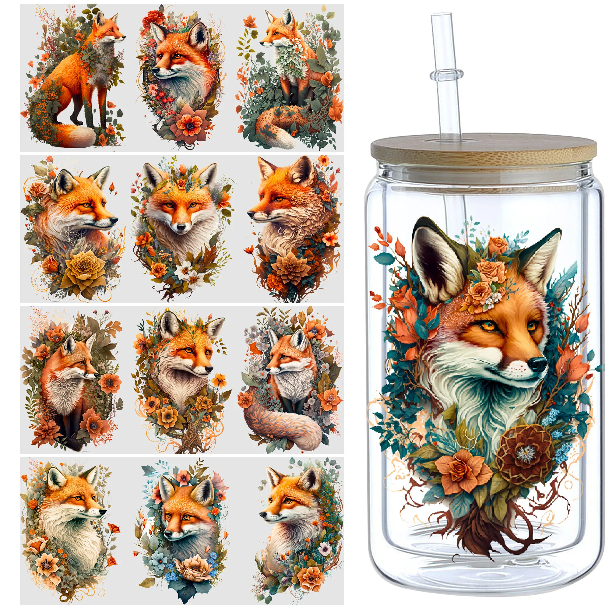 5 sheets fox UV DTF cup packaging for 16oz glass cup, waterproof and elegant fox stickers suitable f...