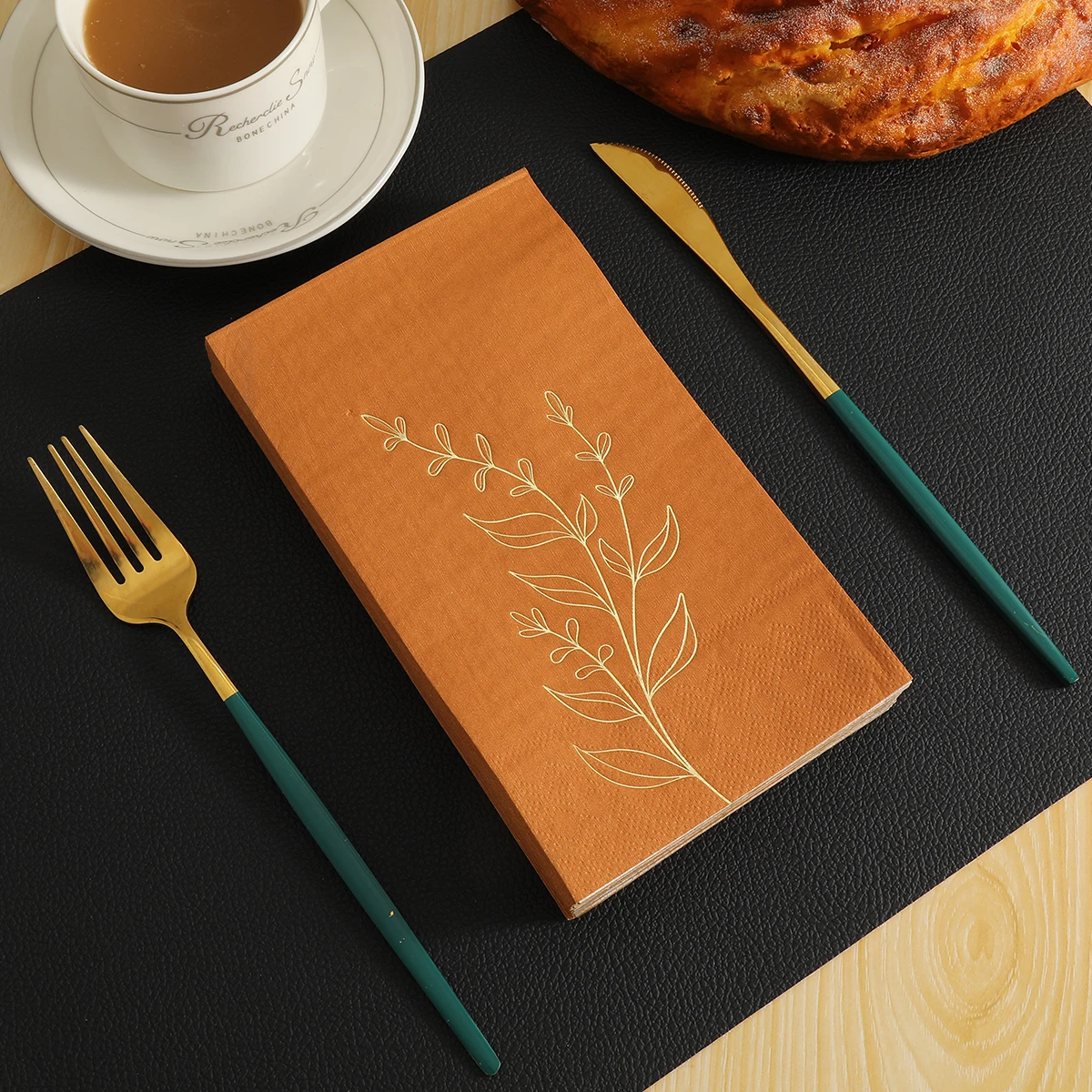 20pcs brown napkins with gold foil printing, featuring small grass and eucalyptus leaf patterns, sui...