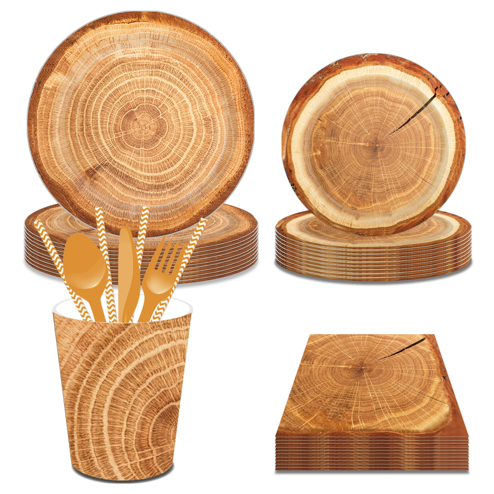 Solid Brown Imitation Wood Grain Party Disposable Tableware Sets Birthday Paper Cups Napkins Plates ...