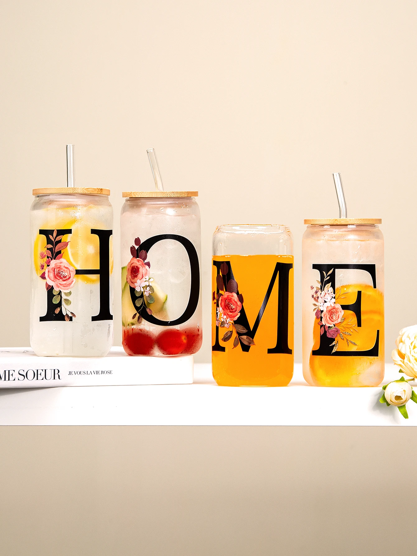 500ml Letter Flower A-Z Coffee Cups Office Home 16OZ Glass Cup With Bamboo Lids & Straw Birthday...